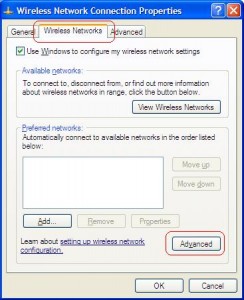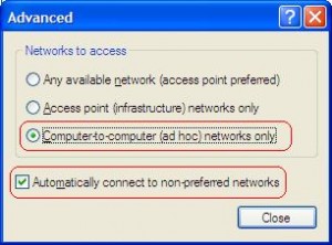 4. Pada menu advance pilih yang ” computer to computer ( ad hoc ) network only” dan klik close