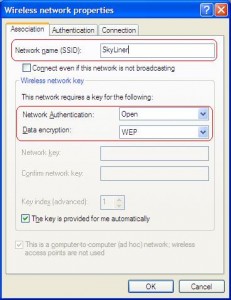 Jika jaringan wifinya ingin di beri password maka pada data Encription pilih : WEP dan hilangkan tanda √ pada ” the key is provided…… dst ” dan kemudian masukan password pada network key. kemudian klik ok.