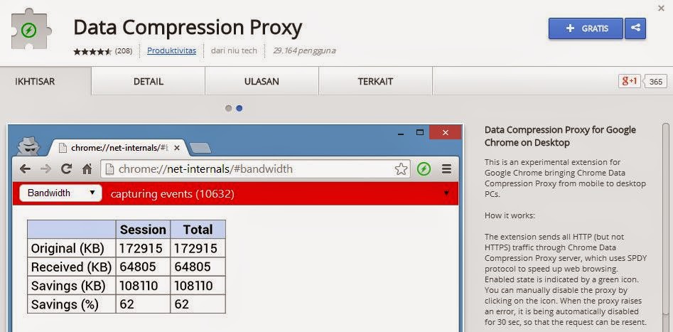 Ketika memasang Data Compression Proxy, programnya akan menyediakan tombol di sebelah kanan bar Chrome, yang bisa diklik untuk mengaktifkan dan menonaktifkan extension tersebut. Ketika diaktifkan, ia akan mengirimkan semua lalu lintas melalui server Google untuk dikecilkan agar kita bisa membuka dengan lebih cepat.Ada juga laman khusus untuk memantau statistik penggunaan data kita dan berapa besar yang sudah kita hemat.