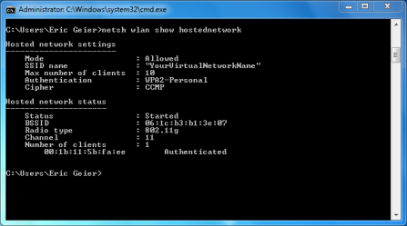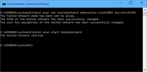 wlan set modus hostednetwork netsh = memungkinkan ssid = kunci Adhoc = sandi